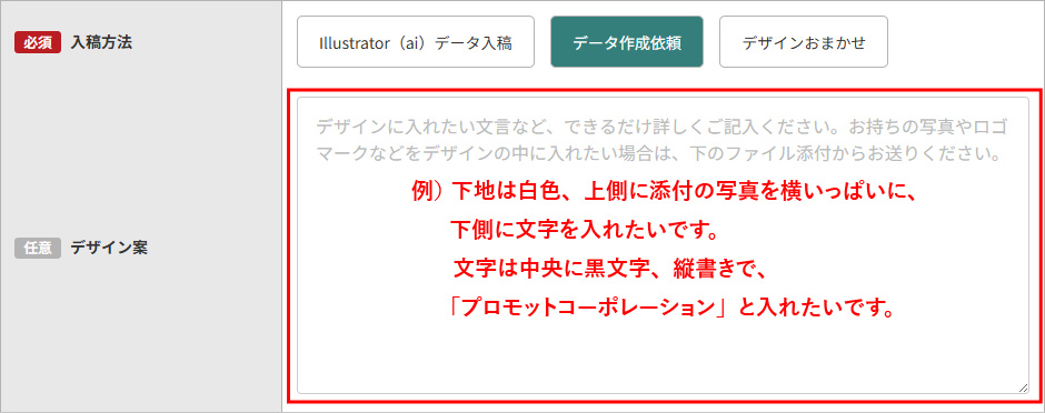 デザインの内容を下記のいずれかの方法でお伝えください。