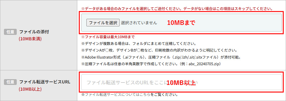 お手持ちの画像やロゴは「ファイル添付」からご送付ください。(※複数のデータをお持ちの方は一つのフォルダにまとめて、zipやlzh形式で圧縮をしてご送付ください。)